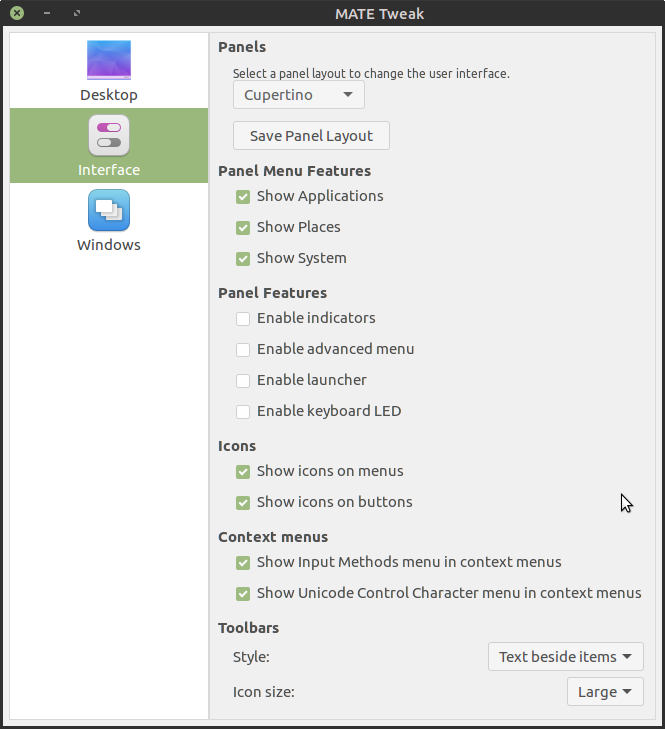 Out-of-the-box the Mate desktop looks near identical to old-school Gnome2 that many longtime Linux users recognise and enjoy. While this is great for (some) old-school users accustomed to this type of workflow, those of you coming from Windows or Mac OSX may find it a bit alien. Luckily the mate desktop comes with a pretty nifty utility called Mate Tweak which allows you to quickly and easily adjust the desktop environment to your liking. You will find the Mate Tweak utility under: System → Preferences → Look and Feel → MATE Tweak. The utility has three tabs: Desktop, Interface and Icons. Under Desktop you can choose which icons, if any, will appear on your desktop. Interface allows you to change the actual layout of the desktop. The first drop-down menu has a number of preset layouts which you can choose from. Surely many of you will quickly recognise that Cupertino and Redmond (Apple and Microsoft’s campus towns) refer to Mac OSX and Windows layouts. Lastly, in the Windows panel you can also switch the close, minimise and maximise button position from right to left by switching from ‘traditional’ to ‘contemporary’.