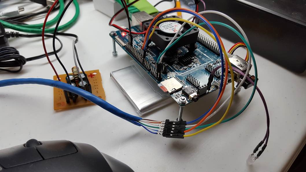 In the pic above machine PineA is shown. I have debian mate running on PineA, and ubuntu mate running on PineB. On each board I have the green jumper plugged into uart0 Tx, and the white jumper plugged into Rx. Again, because the cable is constructed as a cross-over both boards are plugged the same--as long as they are consistent it does not matter. I have the yellow jumper of each board plugged into uart3 Tx on the euler bus, and the orange jumper of each board plugged into the uart3 Rx on the euler bus for each board.