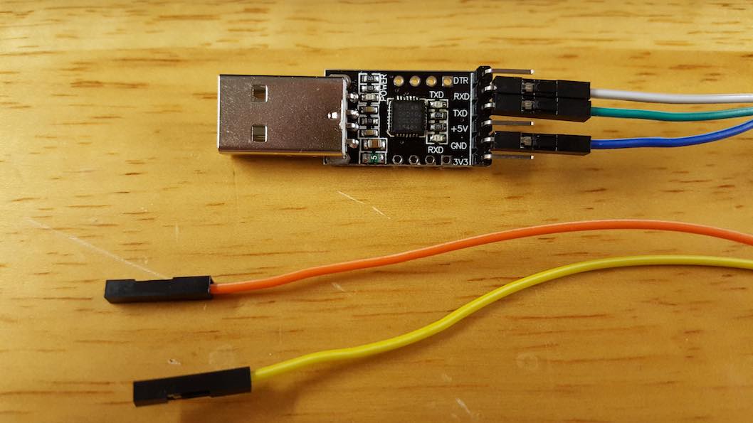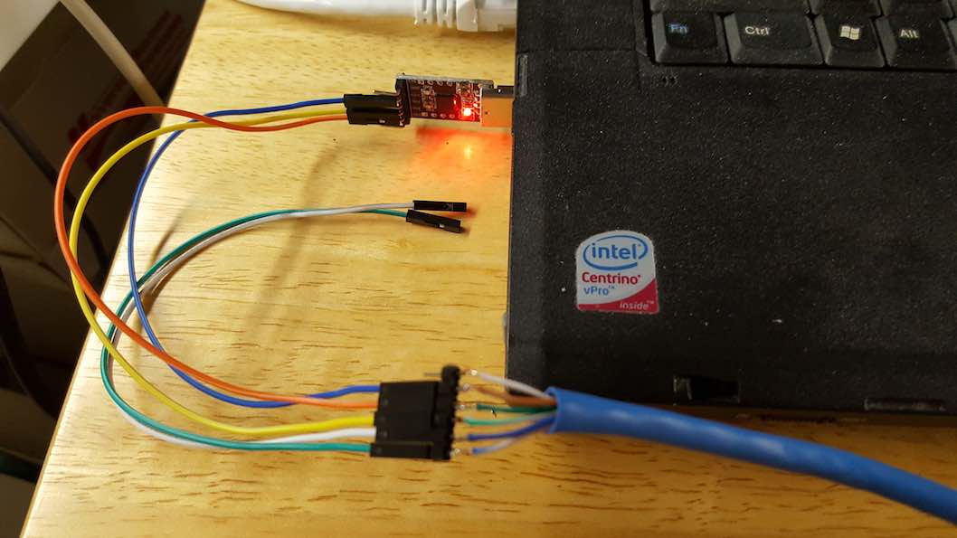 The ends of the Cat5 cable have been removed and replaced with standard male header pins (and spacers) ; again, the orange pair has been ignored. Brown is ground, Blue and Green are the uart3 & uart0 crossed pairs, each containing a crossed Tx and Rx line. No adapters are required; the uart(s) are simply wired together. The cable is something less than 2M and is standard Cat5.