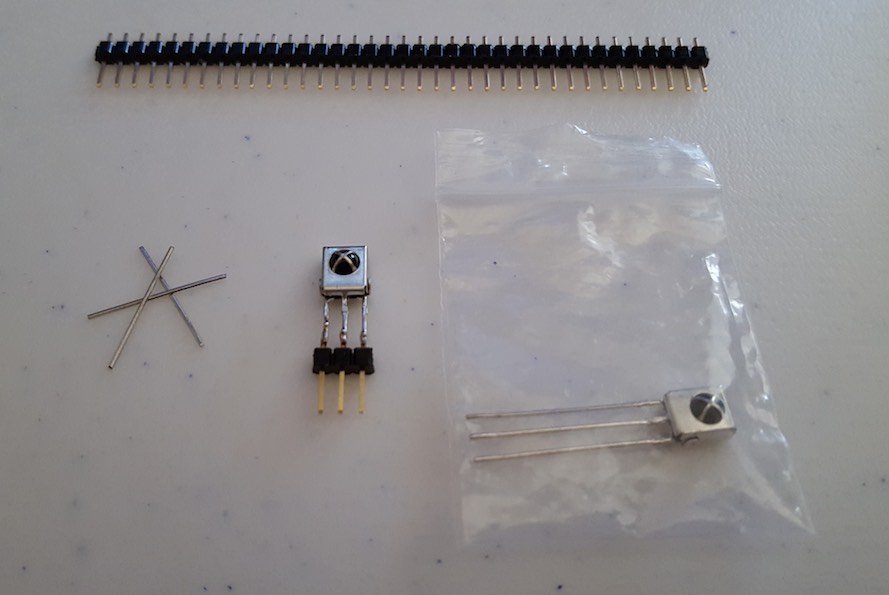 The pic above shows the mod; the un-modded receiver is in the plastic bag. I have cut the leads on the receiver and soldered it to three male header pins (these are designed to fit the socket on the PineA64 SoC board. The technique is straight-forward; tin the leads on both the receiver and the header pins... tack solder the receiver to one header pin (leave them on the row of pins for easier handling). Then, solder the other two leads, returning to the tack point and re-solder the first lead. Then to finish up, cut the modded IR receiver from the row of header pins.
