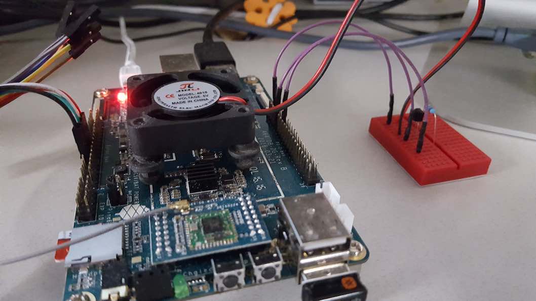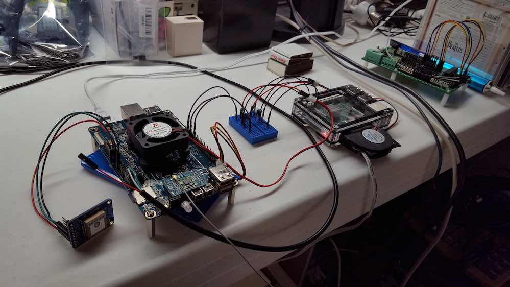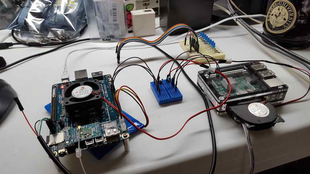 The fan above is a 5v brushless 140ma fan (free standing on rubber fan mounts) capable of moving 5cfpm ; being driven by a python software PWM motor speed control driver using a PN2222 transistor to handle the current. The GPIO pin signals the transistor via 1k ohm resistor. The codes rely on the RPi.GPIO-PineA64 module from github.