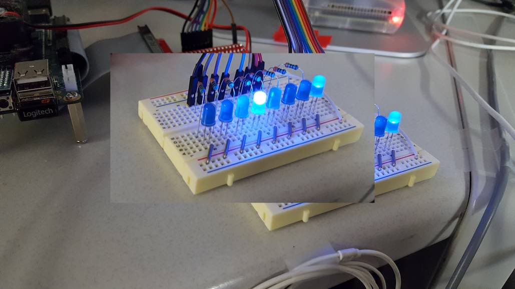 The LED layout is changed to a row of blue 5mm diodes in a single line; the GPIO pins are GP20 - GP27 (BCM Broadcom numbering) on the PI bus.