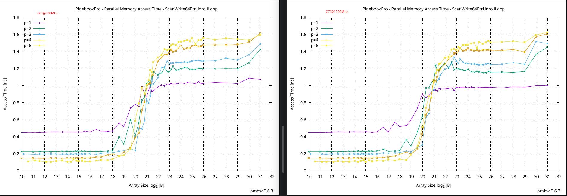 RE: RK3399 OC-UV Voltage Limits - generaleramon - 05-25-2021 i'm working on other clocks too Code: <&cru ACLK_PERIHP> 150000000 <AXI?PERIHP i guess is peripheral high performance PERILP0 must be peripheral low power/performance 0 PERILP1 peripheral low power/performance 1 i still don't know what kind of devices are attached, i'm guessing that the Mali GPU use the HP one(Edit: Nope) Looking at slide 12 (https://fileadmin.cs.lth.se/cs/Education/EDAN35/guestLectures/ARM-Mali.pdf), i think that the APB is used as a command bus, while AXI and AHB are used for moving data the AHB bus usually run at 1/4-1/2-1/1 the APB speed ### Edit: Testing the CCI@1Ghz, gained another 25-50MB/s and the latency is lower. I'm gonna run some benchmarks and post some graphs ### Edit v2: Testing CCI@1.2Ghz(+100% over Stock), getting around 3580MB/s memcpy and amost 8500MB/s memset. No stability problems ### Edit v3: Currently running these seconday clocks, stable at the moment, no gains from increasing PERIHP/PERILP. I tested PERIHP@800+400+200Mhz and the GPU performs the same, no idea what is connected to that bus Code: <&cru ACLK_PERIHP> 160000000### Memory Latency CCI@600s1200Mhz > Memory Bandwidth CCI@600s1200Mhz > 7Zip Multithread-Benchmark Code: ###600Mhz CCI### Edit v4: No, 1400Mhz is not improving performance, i'm starting to see some regression, i guess because of some form of build-in ECC RE: RK3399 OC-UV Voltage Limits - dsimic - 06-04-2021 (05-25-2021, 10:30 AM)generaleramon Wrote: i placed a piece of thermal pad between the shield and the backcover now to press it down and be sure to have more contact, i'll report back after compiling the kernel again. i can't believe that it needs more than that, BUT, worst case, i'm gonna put some thermal glue and a real heatsink on it an call it a day Have you managed to test the behavior of BQ24171 again, after you've added the thermal pad? I doubt that adding a small heatsink to the BQ24171 would help, simply because there's no air movement inside the laptop case. IMHO, the best we can do is to bring the BQ24171 in contact with the back cover and use it as a heatsink. I'll use an IR thermometer to measure the actual temperatures that the BQ24171 reaches while all of the CPU cores are under heavy load, which will clearly show is the overheating of the BQ24171 the reason why the red LED starts flashing and the battery charging stops. I still need to figure out how to attach a heatsink (and keep it attached) to the RK3399 with the back cover removed, which I need to remove to be able to use the IR thermometer. (05-25-2021, 10:30 AM)generaleramon Wrote: NEWS: i found out how to overclock the CCI(CCI-500,CoreLink Cache Coherent Interconnect, so it works like the infinity fabric in AMD Ryzen CPUs). in the rk3399.dtsi file "cru ACLK_CCI" is set to 600Mhz (Thanks to this GitHub Commit), i upped it to 800Mhz and i instantly gained 150-200MB/s in memcpy (3550MB/s) and memset (8200MB/s). The entire SoC should benefit as the CCI manage all the data flow and cache/memory coherency. Still no idea if it is 100% stable and if i can push it more, i need time Those are very interesting results, thumbs up! Any chances, please, to provide the "make -j6" timing results for the kernel compile at 100% stock settings, and with the highest overclocks you've achieved so far? I'd be very interested to see those numbers. RE: The RK3399 Overclock/Undervolt/Voltages Thread - generaleramon - 06-05-2021 Here is the first result with my config : 4xA53@1704Mhz / 2xA72@2208Mhz / GPU@1100Mhz / CCI-500@1200Mhz I'm compiling on a decent SD card, not the internal eMMC ==> Finished making: linux 5.12.9-99 (Sat 05 Jun 2021 23:10:05 CEST) real 213m31.122s user 1047m18.520s sys 76m19.904s and yeah, i'll work a bit more on the cooling of that BQ24171, a fan blasting air at the backcover seem to mitigate the blinking led problem RE: The RK3399 Overclock/Undervolt/Voltages Thread - dsimic - 06-05-2021 (06-05-2021, 03:17 PM)generaleramon Wrote: ==> Finished making: linux 5.12.9-99 (Sat 05 Jun 2021 23:10:05 CEST) Could you, please, run the same kernel build on your PineBook Pro with the stock frequencies? It's a bit hard to do a comparison without that. (06-05-2021, 03:17 PM)generaleramon Wrote: and yeah, i'll work a bit more on the cooling of that BQ24171, a fan blasting air at the backcover seem to mitigate the blinking led problem I've been using my PineBook Pro for a while with the following restrictive thermal throttling parameters applied (kind of anti-overclocking): Code: echo 55000 > /sys/class/thermal/thermal_zone0/trip_point_0_tempWith those settings in place, I had no red LED blinking even with maximum CPU load, while the CPU temperature always stays below 55 oC. This pretty much confirms my assumption that the heat soak from the SoC causes the BQ24171 to overheat and stop charging the battery. |
