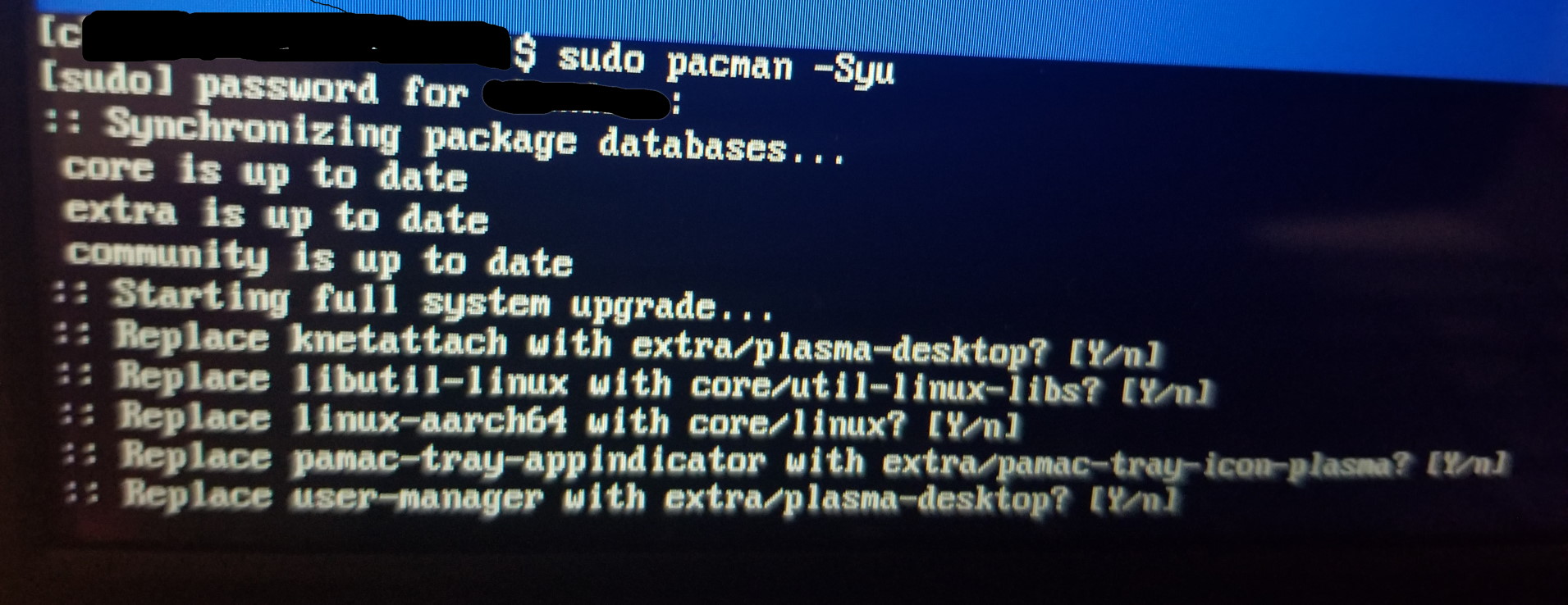 Pinebook Boot - CharlesBunders - 05-05-2021 Just got my Pinebook Pro. Used it for a while and now won't finish booting in to Monjaro. Just a cursor in the top left. I can ctrl-f4 and it kicks to a command line prompt. Is there a way to just reset the system back to initial factory? I tried to do a sudo pacman -Syu and chose no for most of the update questions. Any issues with accepting the defaults of this with a new system? RE: Pinebook Boot - tophneal - 05-05-2021 out of curiosity, why did you choose not to update your system? there's enough Manjaro/PBP users that system breaking updates typically get fixed. they best way to go back to factory fresh would be to rewrite a Manjaro img to the emmc. Check the Manjaro SD-to-eMMC imgs or check the NOOBs page of the wiki for how to easily do that. RE: Pinebook Boot - CharlesBunders - 05-05-2021 (05-05-2021, 09:13 AM)tophneal Wrote: out of curiosity, why did you choose not to update your system? there's enough Manjaro/PBP users that system breaking updates typically get fixed. It prompted to use library's in different locations and make changes. I usually use Debian and I am familiar with apt-get haven't used pacman in some time. When prompted like this I didn't know if it was a Manjaro update or something specific to the Pinebook setup that would break functionality of the Pinebook. So I chose no when prompted to use alternate library paths. RE: Pinebook Boot - wdt - 05-05-2021 >It prompted to use library's in different locations and make changes. I'm guessing you mean different repositories????? If so, this means no network Check,,,ip a Then,,,, nmtui I really hosed my sd card boot a week ago, had to go thru this and more Usually pacman -Syu is the main recovery method RE: Pinebook Boot - CharlesBunders - 05-05-2021 [attachment=2328 Wrote:wdt pid='94077' dateline='1620230391']>It prompted to use library's in different locations and make changes. Not different repositories. Image attached. nmtui worked great. I could activate the network connectivity and ran pacman -Syu. I chose Y for all the suggestions and once complete it still boots and just has a cursor flashing in the upper left. Never gets in to Manjaro. Pinebook Boot - Samurai_Crow - 05-05-2021 When I bought my Pinebook Pro it came with an experimental version of Manjaro and required reimaging anyway. RE: Pinebook Boot - wpeckham - 05-05-2021 (05-05-2021, 10:33 AM)CharlesBunders Wrote:If you can get to a command-line prompt you are getting to Manjaro. What you are not getting is the desktop environment. Is this the default Manjaro install, or did you pick an image with a specific desktop? (I chose XFCE for mine.)(05-05-2021, 09:59 AM)wdt Wrote: >It prompted to use library's in different locations and make changes. RE: Pinebook Boot - wdt - 05-05-2021 OK, like I said I hosed my boot a week ago, so some suggestions If anything says missing. a lib or whatever, pacman -S and reinstall Sometimes hard to find what the package name is (that contains the lib) pacman -Ss name OR -Qs OR -F So,,, sudo systemctl stop sddm ; startplasma-x11 ;startplasma-wayland All the starts probably fail, wayland is likely to tell something missing (most of these require sudo/root) pacman -S xfce4-meta ; startxfce4,,,this may well succeed or else say something missing maybe you will prefer xfce? maybe pacman -S sddm ---more-- If you used an older manjaro image, almost certainly you will have to edit extlinux "../" before image, dtb and initrd Also the fslabel changed, from ROOT-MANJARO to ROOT This about the time of 1 partition -> 2 partition But you have a cli boot so not so likely RE: Pinebook Boot - James Good - 05-06-2021 This might only be slightly related to the topic of this thread. On June 11, 2020, DHL finally delivered the PBP that I had ordered in late October or early November of 2019. Initial power-on was uneventful and the passwords were set as suggested. The PBP was not used, but was fully charged, for about a week then restarted. This second start resulted in the PBP starting another system update or upgrade to the operating system. The battery was full, so there was no real problem. An hour or two later after the update or upgrade finished, the PBP restarted. No problem. However, the password I had set the week before was not recognized and there was no clear way to reset either the root or user password. After several months of trying to turn the PBP back on and start learning how it does (and should) work, near total frustration set in and I attempted to load another version of Linux on it more in the effort to have a laptop that could be used than anything. Multiple attempts by me with several different distros of Linux later the PBP still would not boot. I asked a friend that has programming experience if he would like to try and he did. After almost two weeks, he gave it back to me and said that he was not able to get any OS to load or boot to the internal drive (eMMC) and said that he was at a loss on how to proceed now. He did say that he was able to look at what is on the internal drive and found fragments of TWO different operating systems. Neither he nor I know how to proceed from here. The desired goal would be to be able to have Manjaro loaded and operational on the PBP, but if that is not possible then a recent version of a Debian release could work. But it almost looks like the laptop might need to be looked at in a shop that has the equipment necessary to completely erase then restore the internal drive to a 'factory new' condition. I live in the USA and would prefer to send the laptop to a repair shop in the USA rather than have to send it to another country. Please advise on what steps should be attempted next. Thank you, James Good RE: Pinebook Boot - wdt - 05-06-2021 ????? On Feb 26 you said >I burned a new download of Manjaro to a micro USB card and put it in the PBP. Powered it on and Manjaro got >installed. Seems to be working as it should. ----- So, have you killed it agai