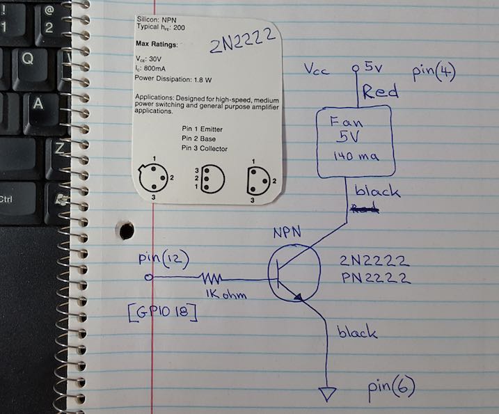 Active Cooling 5v brushless fan with Motor Speed Controller soft PWM - MarkHaysHarris777 - 07-25-2016 The fan above is a 5v brushless 140ma fan (free standing on rubber fan mounts) capable of moving 5cfpm ; being driven by a python software PWM motor speed control driver using a PN2222 transistor to handle the current. The GPIO pin signals the transistor via 1k ohm resistor. The codes rely on the RPi.GPIO-PineA64 module from github. I will be uploading the python codes near the bottom of this post. The following two pics are close-in shots of the fan, and the transistor current driver: The PN2222 transistor above can also be replaced by the 2N2222; although, the emitter collector pins are swapped-- the emitter goes to ground. The fans ship from Jin LI , and as such take three to six weeks to ship to the U.S. Its the shipping, not Jin LI's fault. These little fans move a lot of air; however, they are also noisy. The speed control circuit quiets the fans considerably to a slight whisper, still moves the air more efficiently, and may be controlled off, or controlled by signal based on SoC temperature. fan_motor.sh Code: #!/usr/bin/pythonThe code may be signaled with a -SIGHUP which when received by the speed controller code will toggle the duty cycle of the soft PWM. from 80% to 100%. A second HUP will toggle the duty cycle back to 80%, or slow speed. There will be a follow-on post with some more pics, as well a simple schematic. edit: I changed the default soft-pwm pin to GPIO23, pin(16). marcushh777 RE: Active Cooling 5v brushless fan with Motor Speed Controller soft PWM - CaptainZalo - 08-18-2016 I'm interested in building a smart-fan solution for my pine board as a wild C4Labs' Zebra case appeared in my mailbox today. The fan emits a high-pitched whine. Do you have a diagram of your circuit, Marcus? RE: Active Cooling 5v brushless fan with Motor Speed Controller soft PWM - MarkHaysHarris777 - 08-19-2016 (08-18-2016, 04:22 PM)CaptainZalo Wrote: I'm interested in building a smart-fan solution for my pine board as a wild C4Labs' Zebra case appeared in my mailbox today. The fan emits a high-pitched whine. Do you have a diagram of your circuit, Marcus? ey Captain, yes, I have a diagram I'll be posting later this evening; as well, I have a couple more pics showing how to mount the driver transistor in-line with the power feed (no ciruit board), and I have updated the codes. Be looking back here this weekend. Thanks for the query ! Edit: PS. I pumped about that case too ! Planning to order soon. RE: Active Cooling 5v brushless fan with Motor Speed Controller soft PWM - CaptainZalo - 08-19-2016 Thanks a bunch, Marcus. It's a bit cramped, to be honest, but it looks sleek, build was easy and it gets the job done. It's a lot better than my old lego mess. The bundled fan is 5v, 0.14A. I'm also wondering about the pin-outs for mounting external system led on the 10-pin exp connector, if possible. I scavenged powerbutton from an old HP wreckage at work, rearranged it and lugged into the 10 pin exp connector through the opening in the top lid. There are two leds on the plastic housing. No tears will be shed if it can't be done.