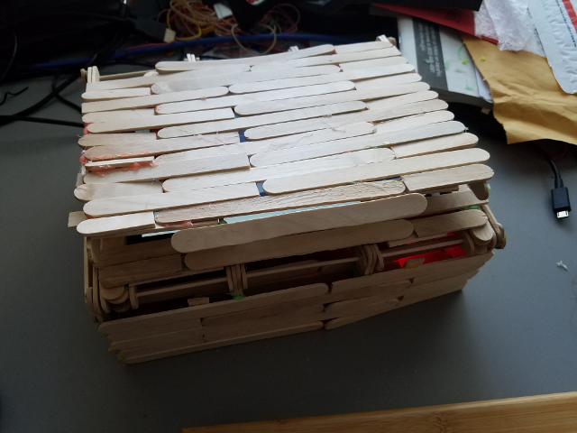 Popsicle stick monitor stand - psychedup - 10-20-2016 Since the pine64's HDMI port doesn't support my monitor's screen resolution, once MackPi figured out how to enable the LCD screen in Linux, I went ahead and ordered 3 of the touchscreens. Sure, they're a bit small, but you can't beat the price. For my mini-desktop machine, I needed something to hold the screen up at the correct viewing angle. I started with a little plastic ipod holder which worked a little, but kept getting knocked down. Next I worked at making something out of cardboard. That would have worked, had I been able to locate some zip ties to attach the screen. But while looking through my garage for the zip ties, I found a box of craft sticks (popsicle sticks) and my mind started working. I ended up making a mini-monitor stand out of the popsicle sticks, some hot glue, and rubber bands. It actually works really well! Here are some pictures of it: That project ended up being pretty fun and easy, so now I'm thinking of making an entire case out of the sticks. I'm imagining making something that folds into a box when not being used, but opens up into something like a mini-netbook. If I can make it work, I'll be looking for a small wooden keyboard and mouse to go with it. Chris RE: Popsicle stick monitor stand - Luke - 10-20-2016 Creative