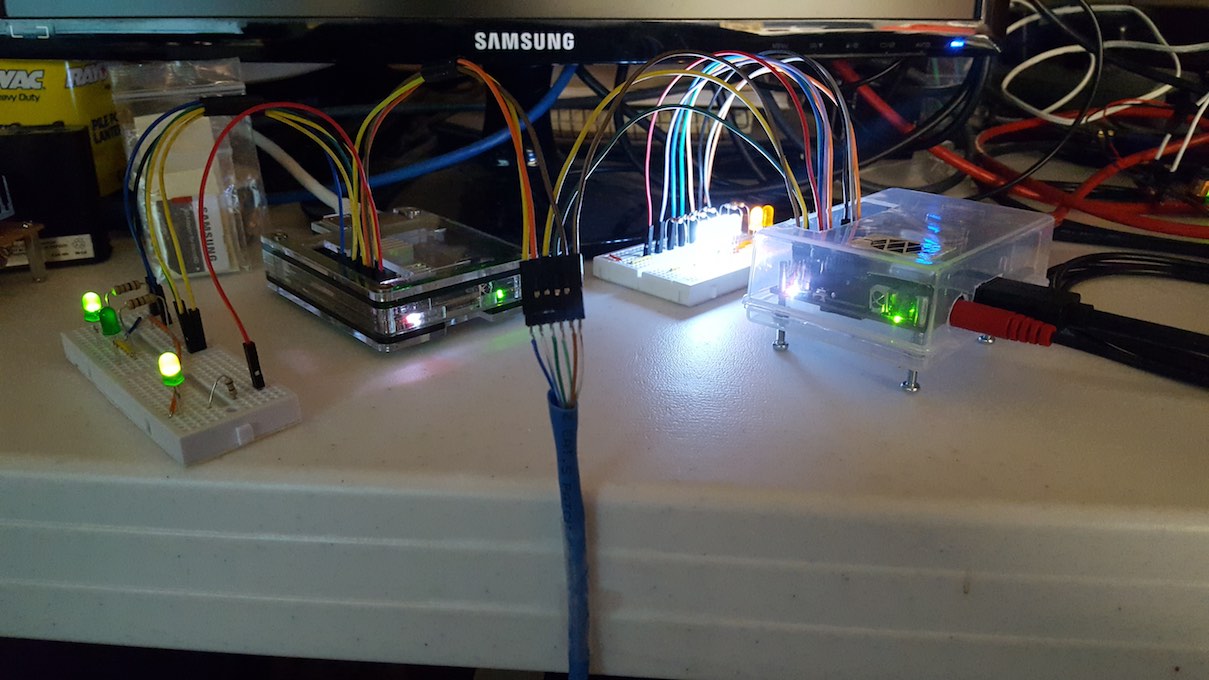 RE: How to Setup Serial Console Cable Over the Rock64 SBC - MarkHaysHarris777 - 08-27-2017 Greetings, This photo blog shows how to setup a direct uart serial console connection using the uart(s) from another SBC like the PineA64+; or any other SBC, like the Raspberry PI, or the Rock64. This is a variation on a theme using our old friend the modified cat5 cable ( RJ45 plugs have been removed and replaced with standard header pins ). The same cable carries two uart connections ( in this case one to Rock64-A and the other to Rock64-B ). The host serial controller is, in this case, the PineA64+ desktop machine. Preparation and Materials Besides the remote machines ( the Rocks ) and the host controller ( the Pine ) you will also need one cat5 cable ( 1.8m works well ) and twelve(12) standard F-F 6" bread-board jumper wires to make the connections. An adapter board is not necessary in this use case because the uart connections are direct; Rx-->Tx, Tx-->Rx, gnd--gnd, for each remote machine. In the picture(s) above you can see the details of the connections on the remote side of the comm link. The cat5 cable has been opened and the RJ45 plugs have been replaced with header pins; the orange pair was removed for hook-up wire. I'm using the blue pair for ( Tx Rx ) on the Rock64-A, and the green pair for the ( Tx Rx ) on the Rock64-B. The brown pair is being used for the ground returns; all three wires are necessary for each machine uart direct connection. At this juncture I'll point out that each pair has a solid and striped color for the pair ( blue brown or green ). For a given machine if the Tx of the remote is connected to the solid color, the Tx of the host for that connection must be connected to the striped wire. This guarantees that Rx-->Tx, Tx-->Rx, gnd--gnd is true for both machines. Of course it is entirely arbitrary which way you do this, as long as you're logically (and color wise) consistent ! Modifying the cat5 cable is straight-forward and the easiest approach. You might alternatively decide to use a juntion box of some sort containing header pins and RJ45 connectors; this does not require modifying the cat5 cable but is more involved ( and more expensive ) in terms of time and money. The pic above right shows the big picture; again, I like to tape the transmission line to the table top and keep it out of the way, and its best to keep the jumper wires organized and neat. In the enlarged inset detail above I am showing the host controller connections on the PineA64+ , utilizing the uart(3) and uart(4) , /dev/ttyS3 & /dev/ttyS4 respectively. The transmission cable ( modded cat5 ) comes into the pic on the top right-hand side. I have labeled the wires as carefully as possible because it is hard to see how they terminate at the euler bus visually. Again, each uart connection is direct and each connection requires three wires; Rx-->Tx, Tx-->Rx, gnd--gnd. I will be using the PineA64+ uart devices /dev/ttyS3 & /dev/ttyS4; these devices live physically on the euler bus, the pinouts of which may be seen in this diagram. Again, its important to note ( even repeat pedantically ) that the Tx and Rx lines of each connection MUST cross; the easiest way to keep this straight is that if you connect Tx to solid blue on one end, connect Tx to striped blue on the other end ! Once the connections are made you can start the vt102 terminal emulation software in minicom; for all intents and purposes this is the same here as in our previous adapter use case(s). important note: If the transmit line from the host controller is connected to the Rock64 board at boot-up often the Rock64 will not boot. The simple solution is to wait to plug in the Tx line from the host controller until after the Rock64 has booted and the logon prompt appears on the console. Start the VT102 Terminal Emulation Software in Minicom Open a terminal on the host controller ( PineA64+ in this case ) and drag the bottom of the window frame until the indicator shows 80 x 25. This is important if you want to see the status bar on your minicom session! Start the VT102 terminal emulation software with the following command: sudo minicom -s -D /dev/ttyS3 -b 1500000 --color=on Note: the baud rate is 1.5M (1500000) and the device is the uart(3); Rock64-A in my case here. When the minicom opens and presents the config dialogue choose Serial Port Setup and press the enter key. Make sure the defaults are correct, and also make sure that hardware & software flow control are off ! Press the enter key, and then select 'Exit' and press the enter key; congratulations the VT102 terminal is running. At this time ( if the remote machine is running ) you may press the enter key to get the logon prompt, and logon. Otherwise, if the remote machine is NOT running, then apply power to the remote Rock64 and watch the boot-up messages scroll down the VT102 terminal. Of course both of these connections ( Rock64-A & Rock64-B ) can be running at the same time; to start the second connection open a tab on your terminal window and use the same command found above; this time choosing the /dev/ttyS4 device ( everything else remains the same ). In the left pic above you can see the Rock64-A connection running , and in the pic to the right you can see the Rock64-B connection running. Both of these connections are running at 1.5 baud and without any adapters because the connections are direct uart-to-uart. Notes: The host controller can be ANY SBC that you happen to have, another Rock64, a Raspberry PI, and Odroid, etc. Also, the connection does not have to be dual; a single connection works fine on the same modded cat5; however, I will add this final caution : the Rock64 uses a very fast connection speed ( for serial ) and 1.5M baud is subject to radio frequency impedance and transmission rules and mathematics; due to reflections in the line, impedance mismatches may occur that will require you to perhaps modify the length of your transmission line; although, in my setu