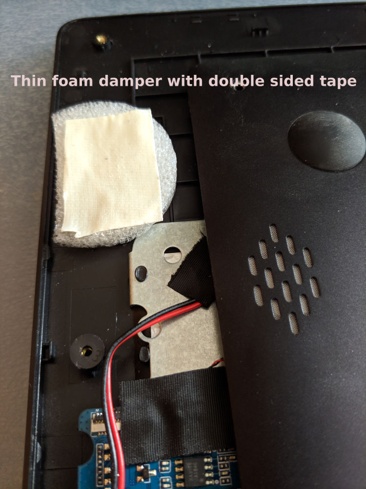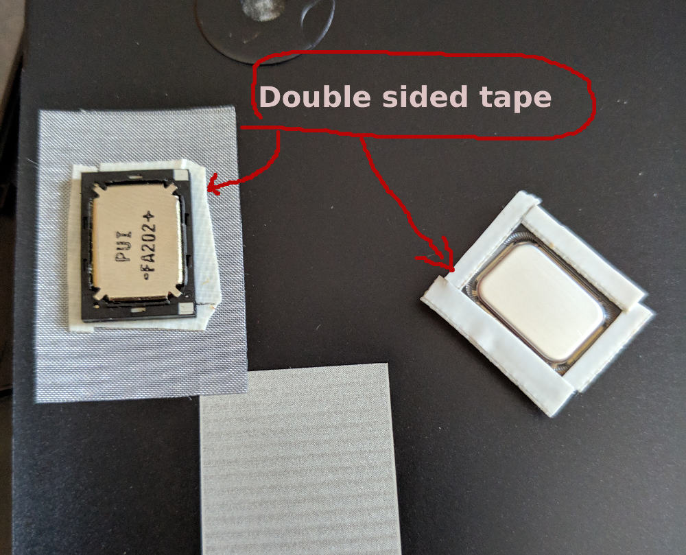 Applying double sided tape to the front contour of each speaker (pic 1), I was able to glue them directly over the mesh/grill areas on the bottom cover. I've then soldered (-) and (+) on both side (pic 2), before covering with electrical tape (pic 3). The finishing touch was to apply some thin foam layers with double sided tape just over each speaker to act as dampers inside the housing sandwich (pic 4).