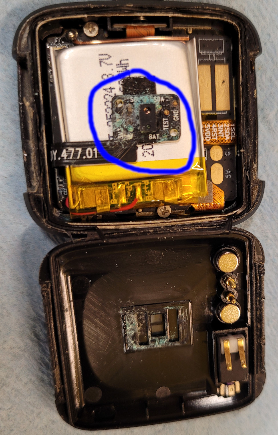 I'm now thinking it might be due to water damage because of the green residue (probably copper oxide) visible in the blue circle on the attached picture. I'm baffled since exposure of my watch to water was limited.