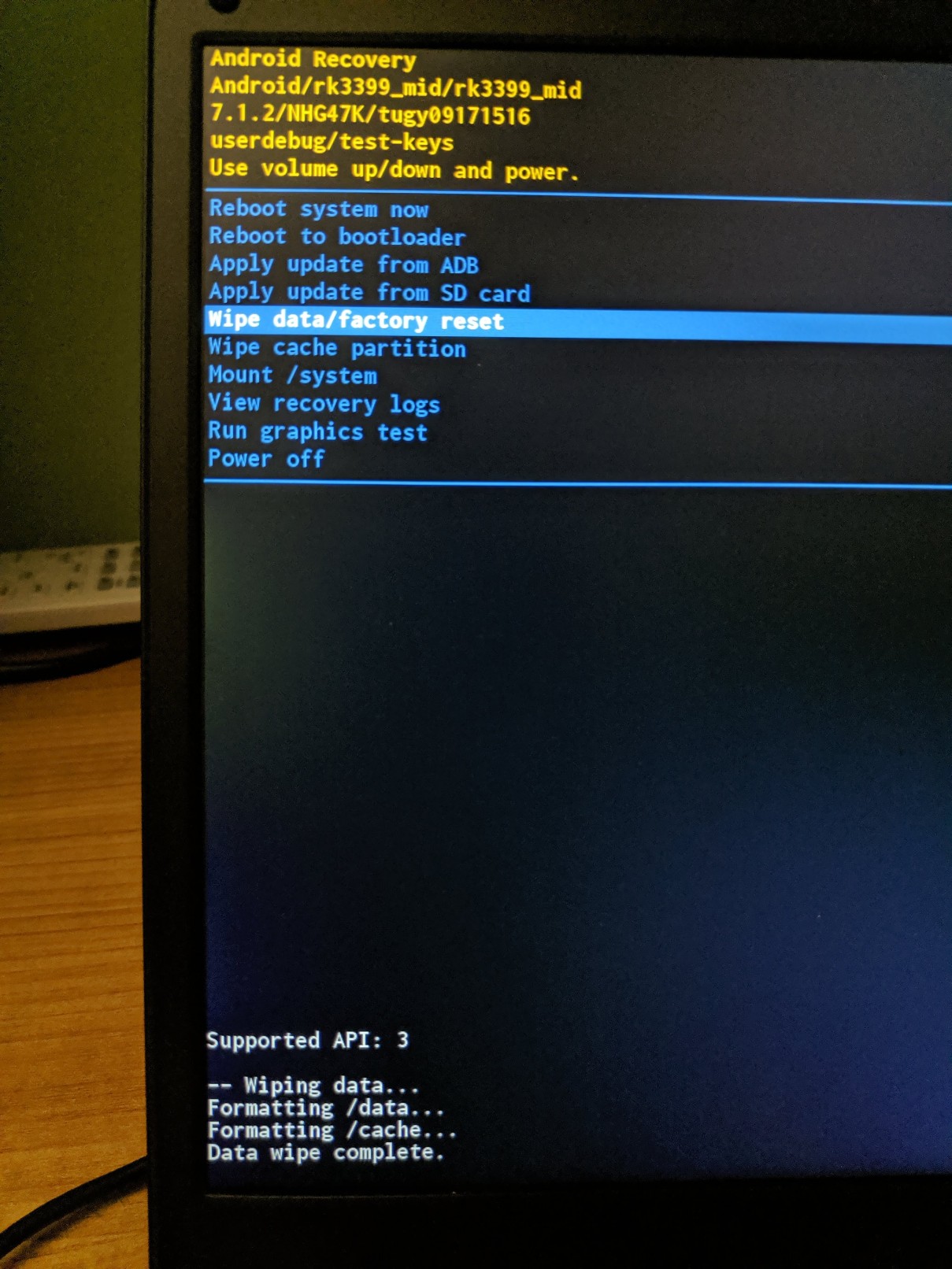 3) Then I tried again to boot the SD card and this time after a couple of minutes I got an actual Android login prompt, where I used the password "rock" but then got a message saying that my "data" (partition) is corrupt and cannot be decrypted, inviting me to press "factory reset", so I did.
