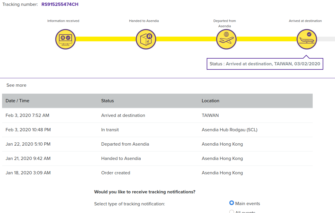 Asendia's tracking service shows it have arrived at Taiwan a full month ago. But it never delivered, nor I can find anything in Taiwan's Customs database. Also Asendia didn't respond to my request.