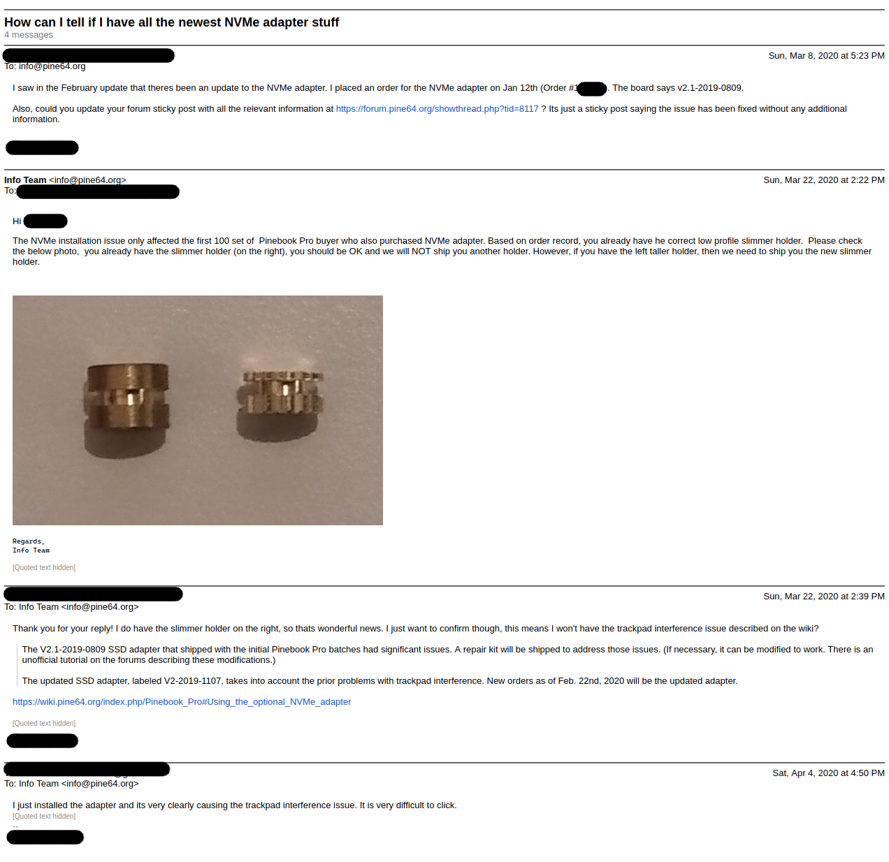 But even overlooking their blatant lies to customers, and hiding behind their hobbyist/some-assembly-required branding doesn't excuse the terrible response from their customer support. I've included my entire support thread below. Take note that at no point did I ask for anything from them other than information, which they continue to avoid supplying. All I wanted to know was whether or not the product I had was going to cause a problem. Well, it turns out that it does, so in summary Pine64: