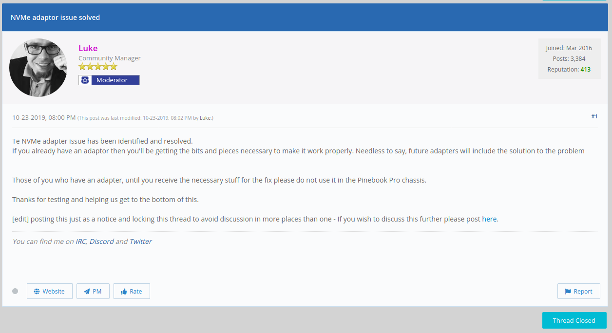 I read the forum before I made the purchase of the adapter. There is a sticky post that has been up since October 2019 saying the NVMe adapter problem has been solved and all future orders will include the solution to the problem. Pine64 LIED. Yes, some users have managed to get it to work with tape and zip ties but this is a MOBILE device so I expect something a bit more reliable for keeping my drive connected.