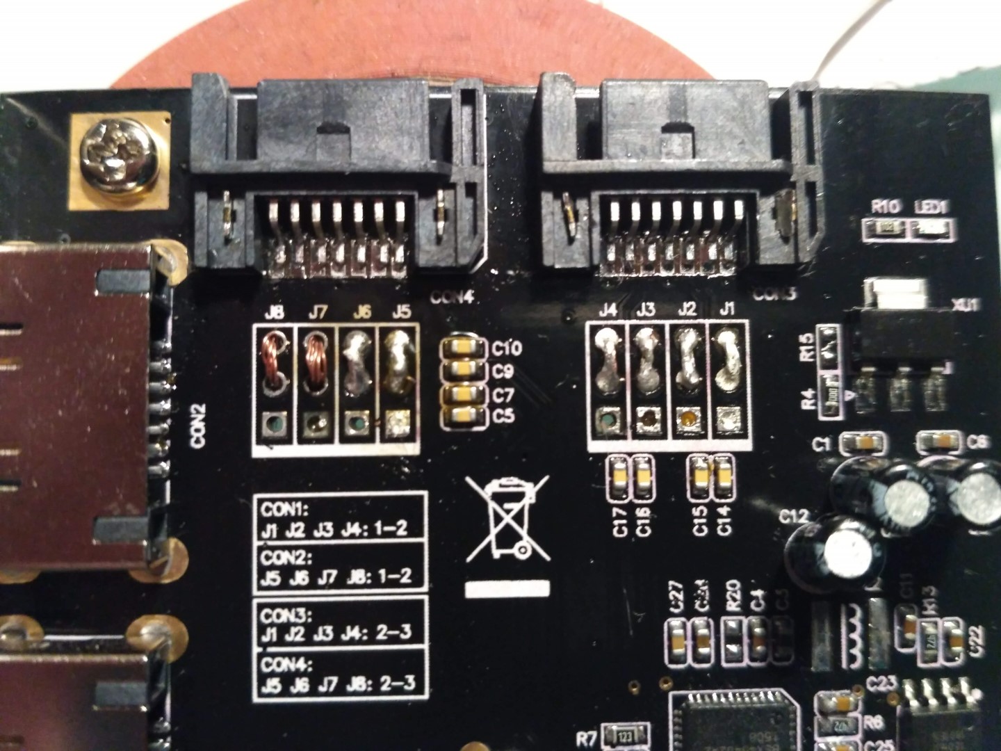 All the jumpers are conducting the signal to corresponding SATA connectors pins? This is right time to check by a DC Ohmmeter. You may loose O-ring if it is on inactive side of PCB. If other side with a PCB trace is OK, the connection will be OK.