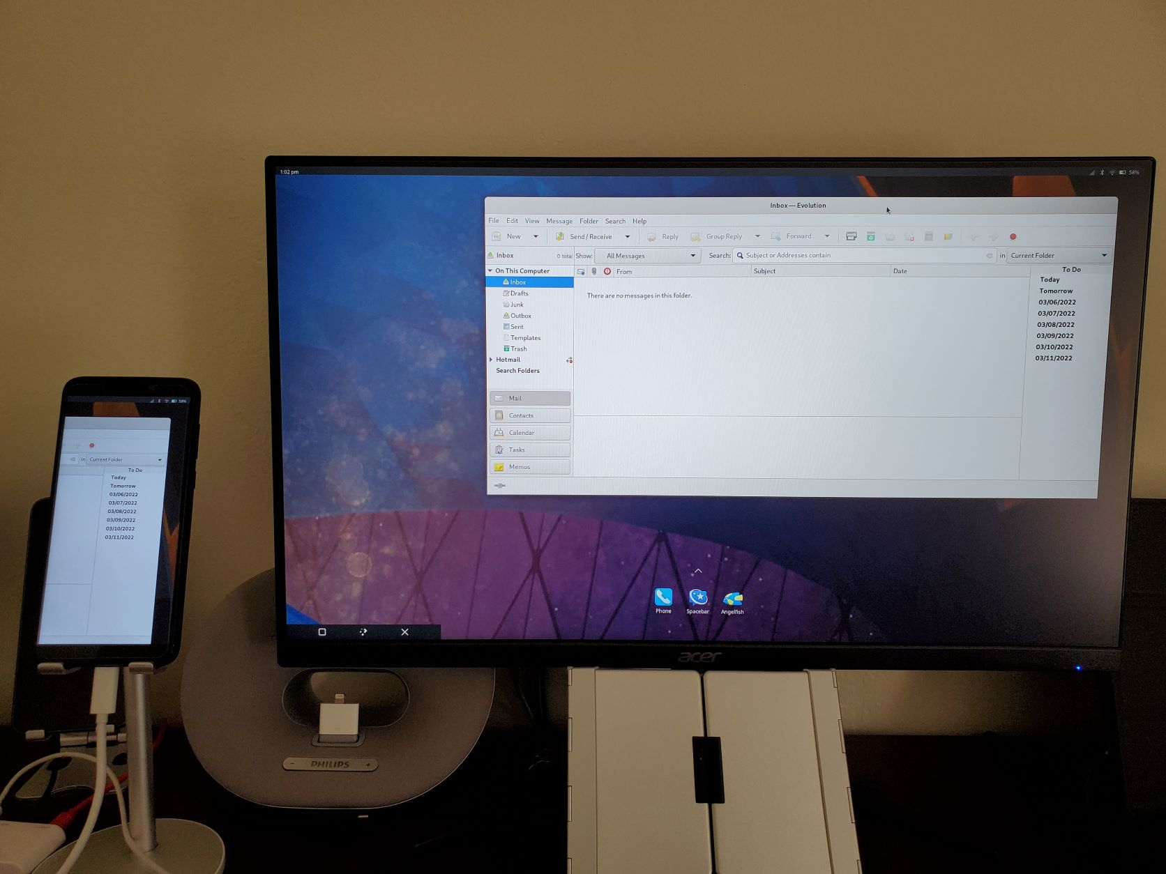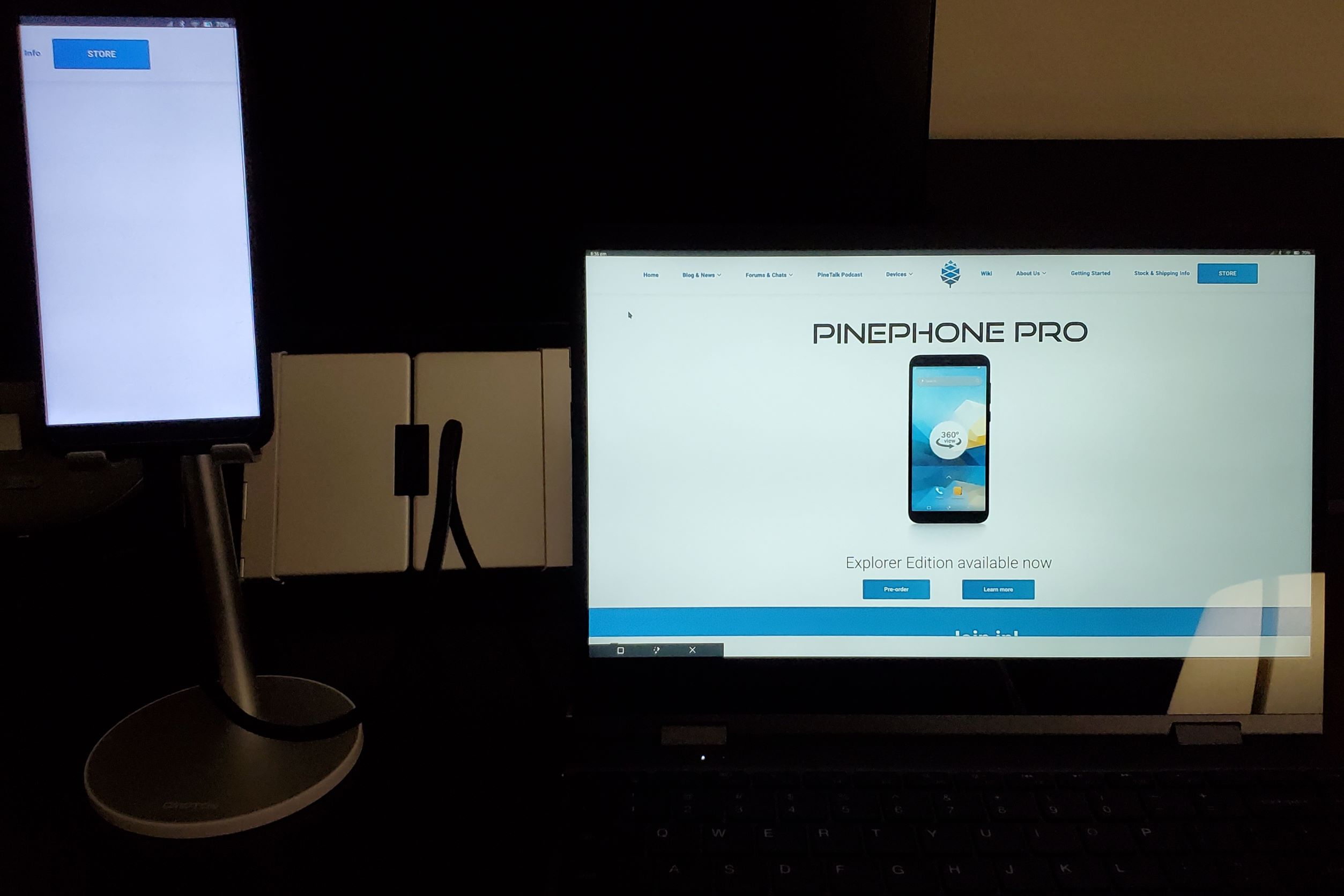 * Photos attached showing the new desktop background and navigation buttons, browser with URL bar at bottom left, and Evolution in windowed mode. Plus the NexDock with the URL bar hidden on the Pine64.com site (the dark photo).
