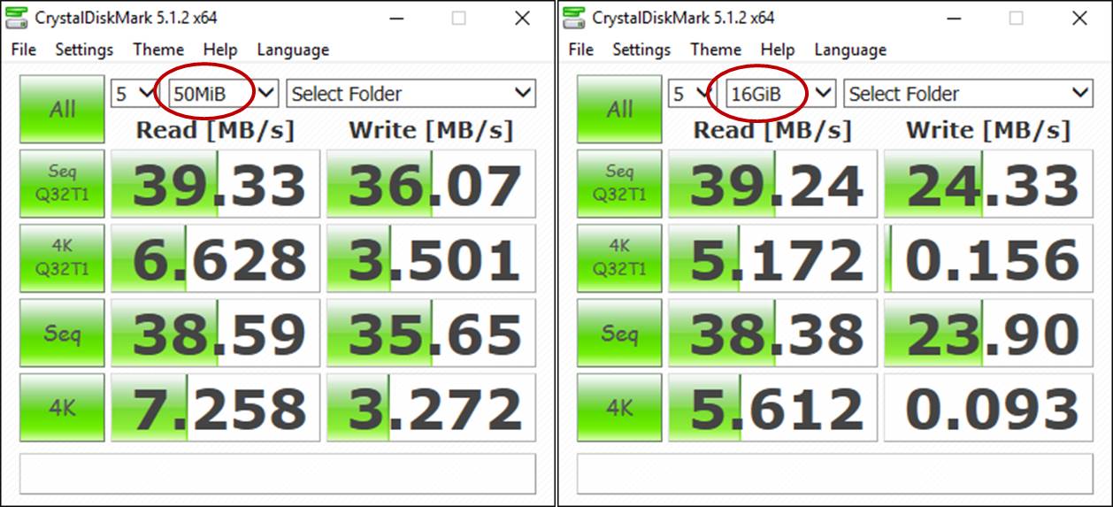 I ran the CrystalDiskMark test twice: with 50MiB and 16GiB (just for kicks).  I was surprised to see such a difference, but the 50MiB compared to the old PNY card is also a stark contrast.