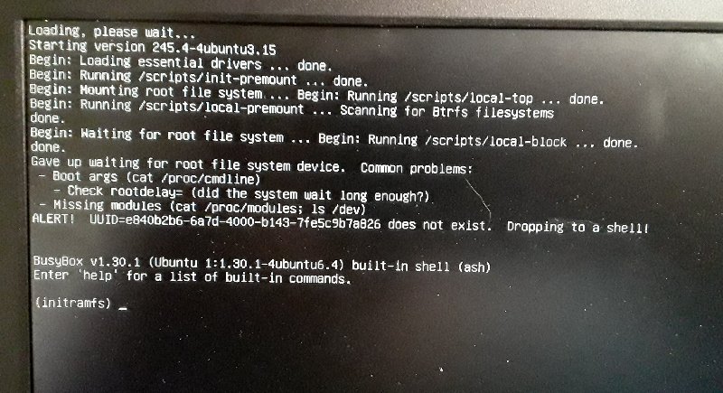 The UUID it says it can't find is the correct one set for the partition. And even though it says it's dropping to the shell, I can't type anything (no, I don't have a serial UART cable). Don't know anything about hardware  initialization process. Anyone have any idea where to look?