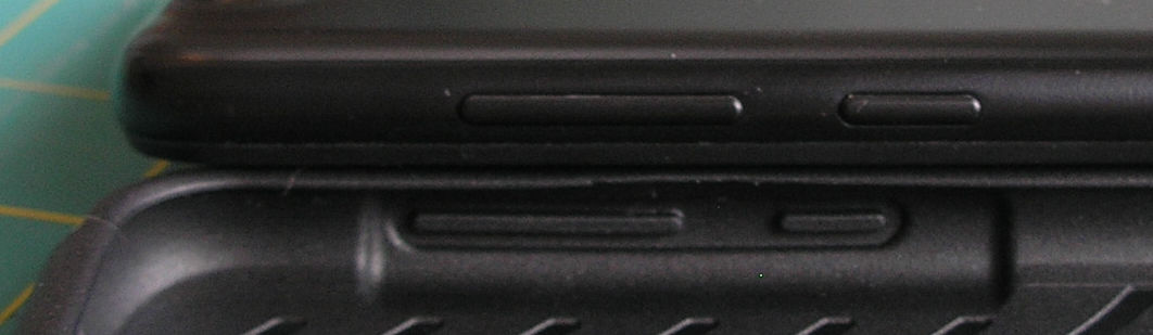 The shape difference is also likely responsible for the gaps between the hard shell and rubber at the ends. Additionally, the holster does not fit the assembled case & PinePhone. Lastly, the rather narrow button depressors may not be optimally centered (front to back) on the PinePhone buttons, and can slip to the side of a button. Fortunately, this only happened rarely, and can be fixed without disassembly by pulling the rubber edge outward away from the buttons.