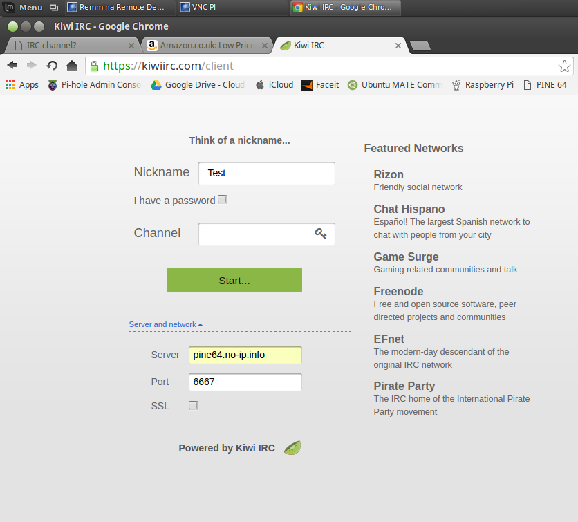 * If you are using a web based client like Kiwi IRC make sure to input the server name: irc.pine64.xyz into the server field and make sure the port is set to 6667. Then all you have to do is press start.