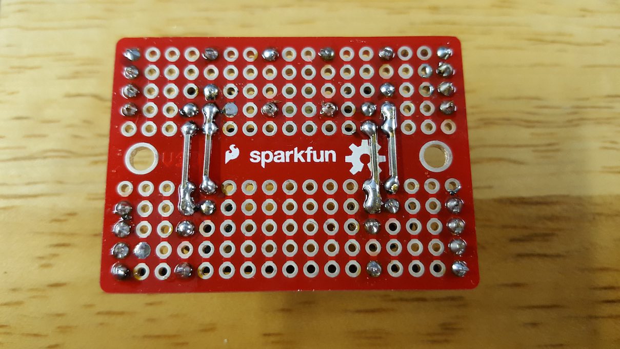The mini solderable breadboard is similar to the plastic pluggable ones; the five vertical pins in each column on the top are connected together; similarly , the five vertical pins in each column on the bottom are connected together.  The components will be moved so that the positive rail is at the top and the negative rail (ground) is at the bottom.