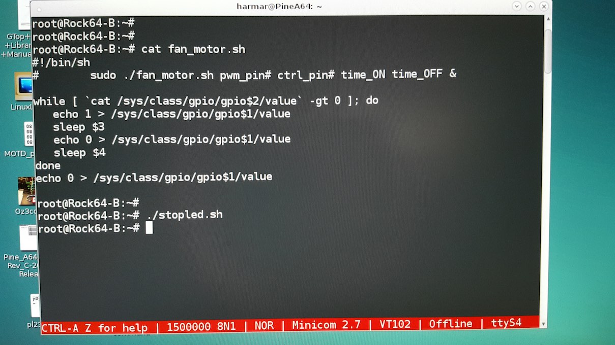 echo 0 > /sys/class/gpio/gpio$1/valueThe pic at the far right-hand is the fan happily spinning away ! The other two pics are views of the control terminal and the commands used to control the 2N2222 transistor bias. The code sets up a loop that monitors the control pin ( in this case gpio83 ). gpio83 must be set HIGH to run the loop, which runs in the background. Momentarily pulling the control pin (83) LOW causes the loop to break and the motor will stop ( the control pin is on parm $2 ).