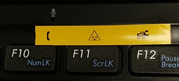 I can never remember which keys disabled what. So I used our label printer to print out icons for a "patch panel" on 1/4" black on yellow vinyl. Since space is tight on 1/4" labels icons were used. The phone means microphone (also F10 is directly under the right mic) the triangle has what looks like a wifi signal for F11 and for F12 is a video camera icon for you guessed it the camera.