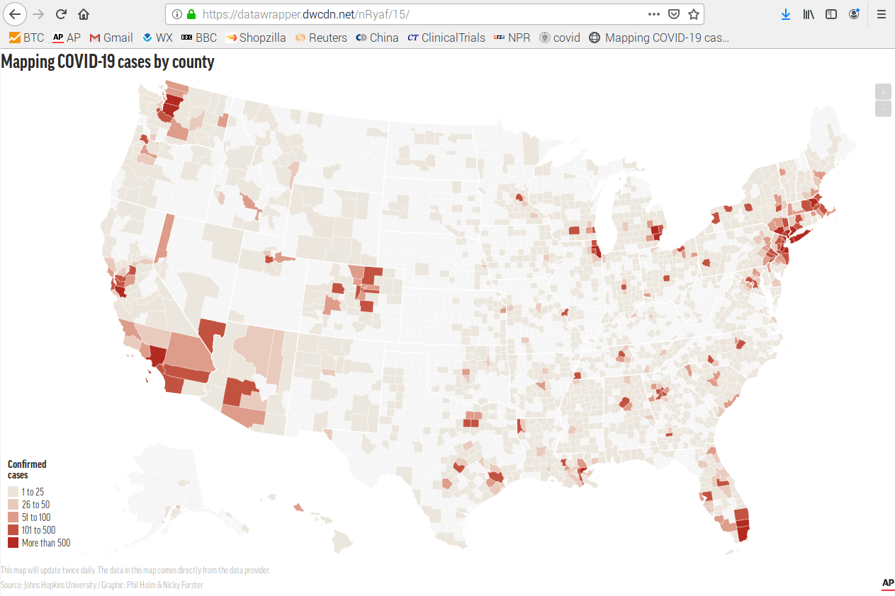 In parts of the US where population density is low there's almost no problem. Not everyone in rural areas is rich by any means. Some people prefer cities, I don't, my nearest neighbors are 1/4 mile (0.4 k m) away. There are no jobs here unless you invent them or commute an hour. No apartments. No internet. It takes work to maintain a vehicle so you can drive somewhere else for a job. I grew up here. The original map is at https://datawrapper.dwcdn.net/nRyaf/15/ but it doesn't always work on bad internet. You can hover your mouse over a spot and read the numbers of cases. It's from the Associated Press. But this is a situation we've created ourselves, much like global warming. We can change it, we just have to all be on the same page in understanding it. The virus will die when it can't infect anybody. China's leaders finally understood that, it's slowly catching on elsewhere.