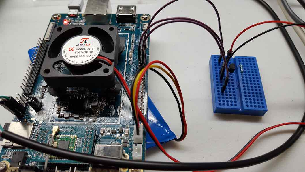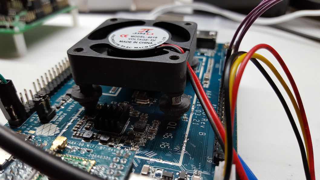 The fan above is a 5v brushless 140ma fan (free standing on rubber fan mounts) capable of moving 5cfpm ; being driven by a python software PWM motor speed control driver using a PN2222 transistor to handle the current. The GPIO pin signals the transistor via 1k ohm resistor. The codes rely on the RPi.GPIO-PineA64 module from github.