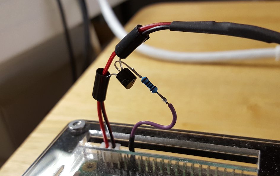 Some of the details are different here than in my diagrams, because here the transistor is from a different vendor and the emitter and collector leads are swapped (note how they are in a straight line--the base lead is NOT offset)... also, I'm using a different GPIO pin, to make soldering to the pins 'easier'.