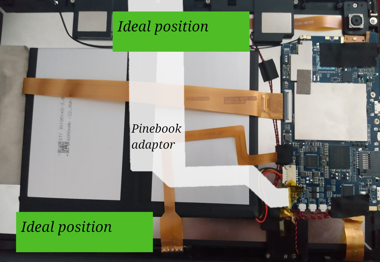 Here I show the outline (white outline) of where the pinebook 2 adapter would be in the pinetab, and the ideal position where an expansion card would fit (green rectangle).