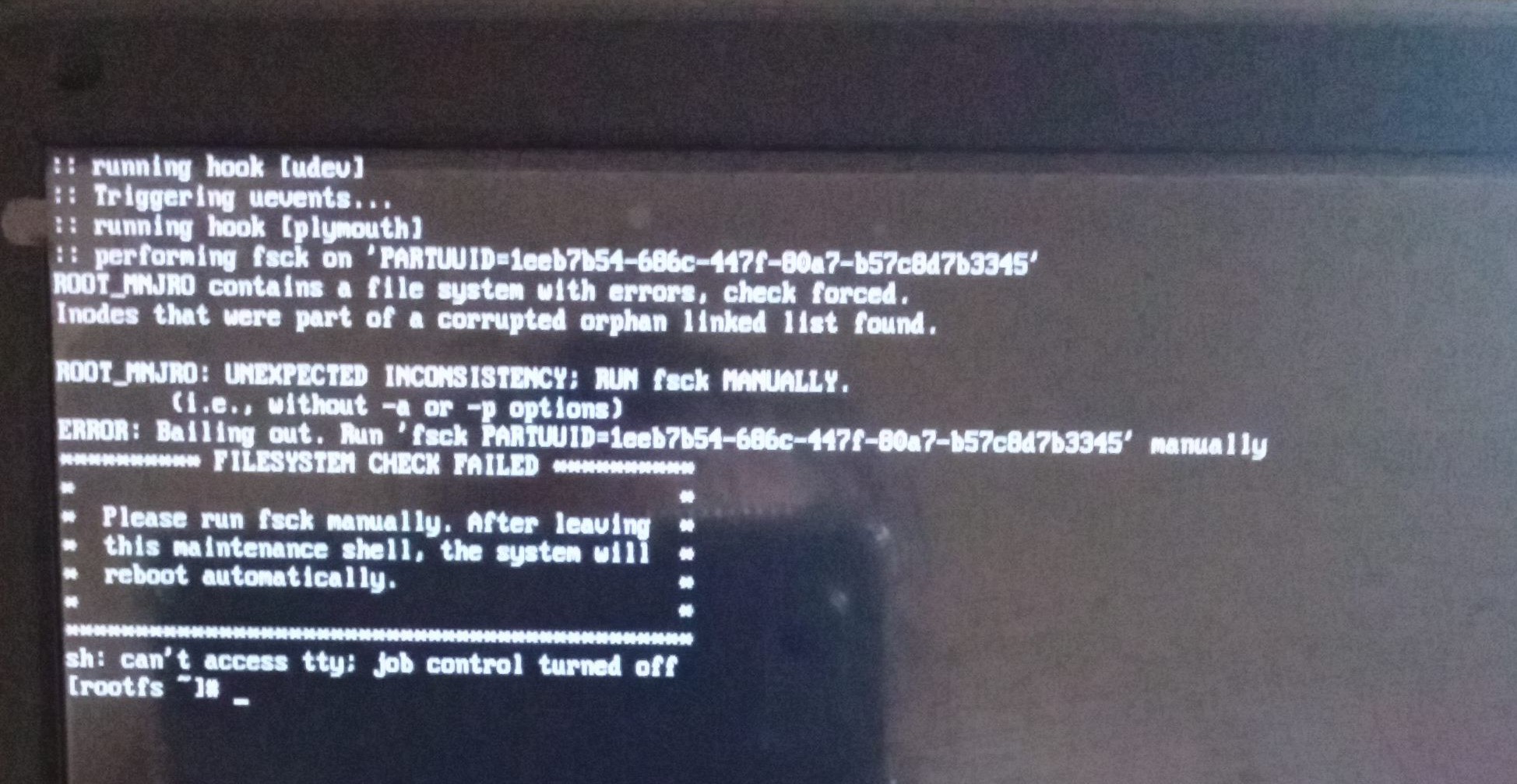 Received the message below. Hard re boot again to black screen and no Manjaro image. Unsure how to proceed. Please advise? Apologies if this was discussed previously