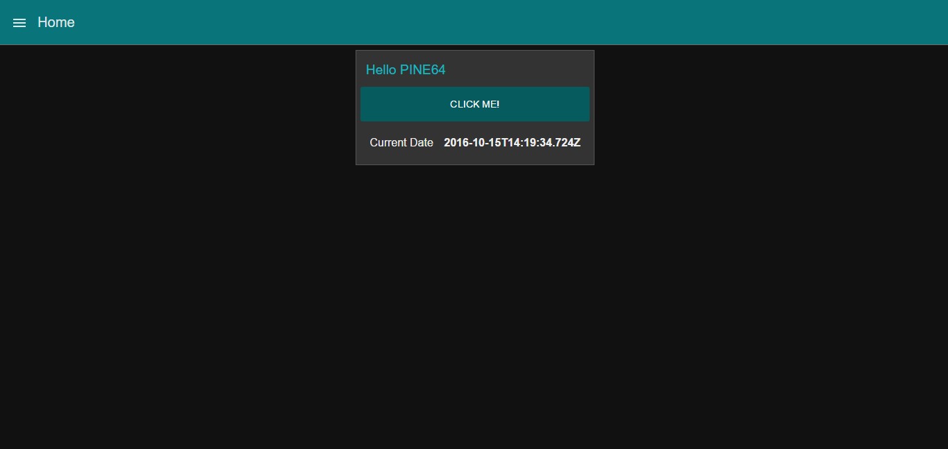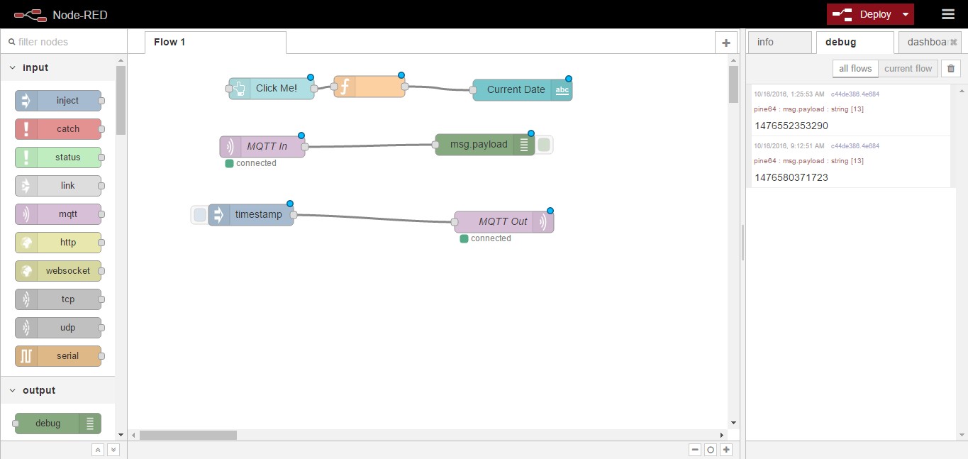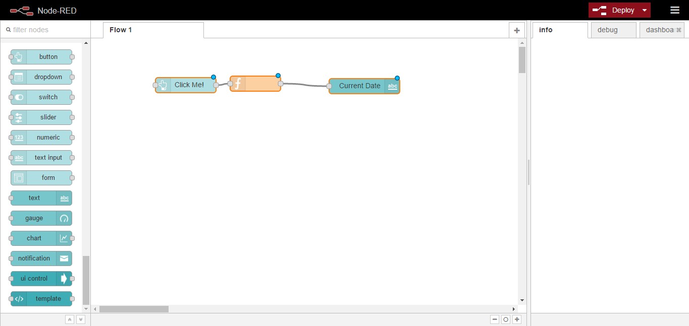 [{"id":"60ba3a72.b24c54","type":"ui_button","z":"5bd1466.b4e63b8","name":"","group":"7e934c94.882ef4","order":0,"width":0,"height":0,"label":"Click Me!","color":"","icon":"","payload":"","payloadType":"str","topic":"","x":188,"y":93,"wires":[["529c0ec4.837a7"]]},{"id":"529c0ec4.837a7","type":"function","z":"5bd1466.b4e63b8","name":"","func":"var d = new Date();\nmsg.payload = d;\nreturn msg;","outputs":1,"noerr":0,"x":326,"y":90,"wires":[["29ee44ea.ad52ec"]]},{"id":"29ee44ea.ad52ec","type":"ui_text","z":"5bd1466.b4e63b8","group":"7e934c94.882ef4","order":0,"width":0,"height":0,"name":"","label":"Current Date","format":"{{msg.payload}}","layout":"row-spread","x":542,"y":95,"wires":[]},{"id":"7e934c94.882ef4","type":"ui_group","z":"","name":"Hello PINE64","tab":"1680a81f.a5aec8","disp":true,"width":"6"},{"id":"1680a81f.a5aec8","type":"ui_tab","z":"","name":"Home","icon":"dashboard"}]
