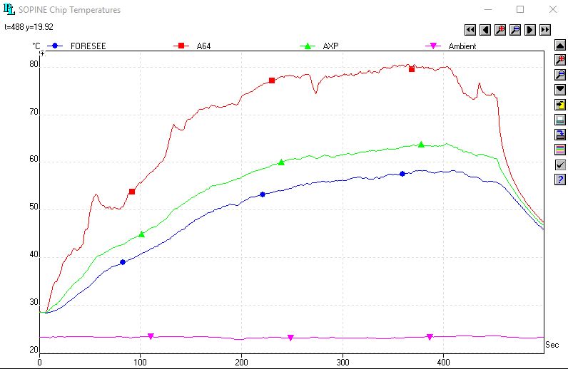 The graph attached shows the surface temperature of the FORSEE, A64 and AXP chips from boot to browsing a web page and viewing a video then shutting down.