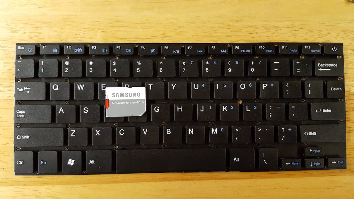 I was finally able to extract the keyboard module from the prototype pinebook base case !  This was a painstaking process made almost hair-pulling impossible due to all of the plastic rivets holding not only the keyboard module, but also the module shield !  I included a standard evo plus SD card from Samsung for relative size correlation; obviously top and verso.  This appears to be the same module as the 14" released version, with the minor exception that the menu button has the ominous Microsoft Logo ;  the mark of the beast.   The pic top right has the module laid out over a sheet of white paper so the rivet marks can be seen more clearly.