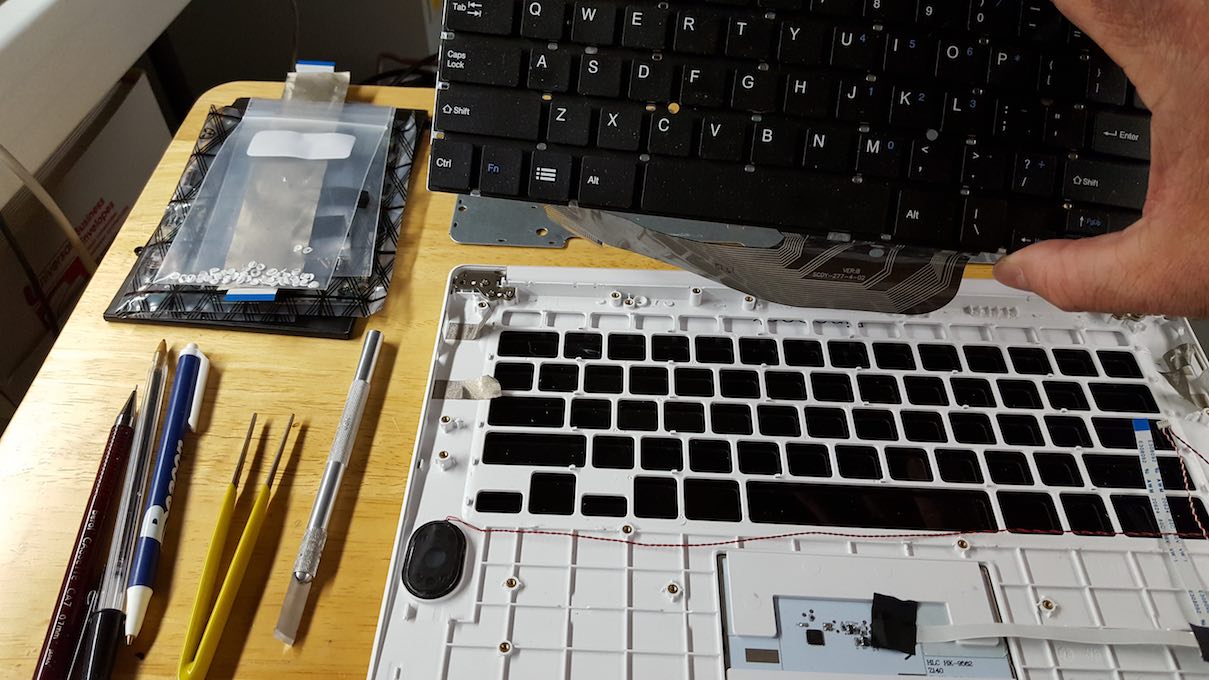 The next step in this project is to connect the keyboard to my pinebook and see whether the typing improves.  I suspect that it will;  the next decision will be whether to attempt to remove the module from my pinebook and swap out the prototype keyboard;  after all I can swap the dreaded Microsoft Logo key , and assuming the layout dimensions are the same then all I have to do is find a good way to redo the plastic rivets--  at this point I'm considering tiny droplets of 30 minute epoxy resin.