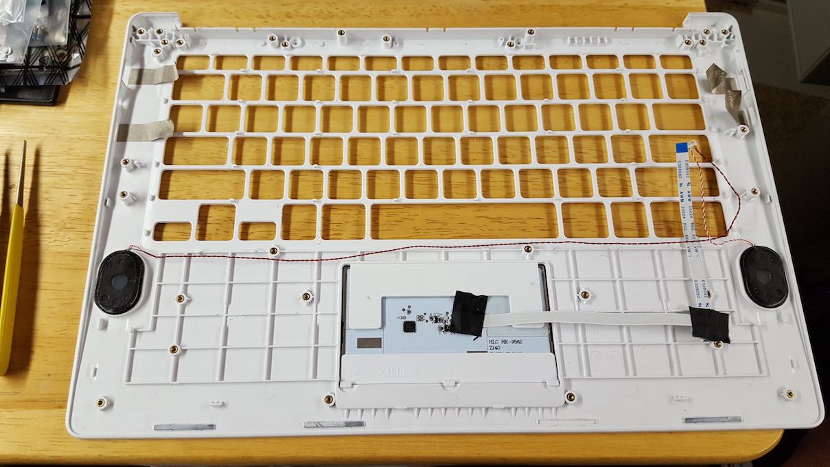 I was planning initially (for the purposes of electrical testing) of swapping out the lower case assembly (containing the prototype keyboard and trackpad) with the lower case on my pre release Pinebook.  This has shown to be not practical. The prototype keyboard is plastic riveted into the lower case, and the lower case is quite a bit larger than the 14" lower case mold-- significantly.  The lower prototype case is 349.25mm wide, and 231.78mm deep. The trackpad is white and is significantly larger too; 74.6mm x 103.19mm.  The only practical way to test the prototype keyboard with my 14" pre release Pinebook is to run an FFC cable extension assembly (with connectors) across the table to the running Pinebook.