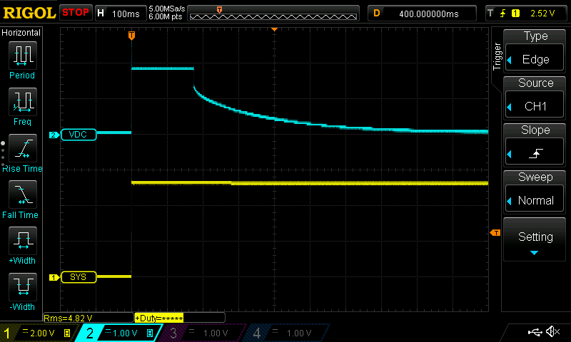 Blue is voltage on 34pin of RK808 "VDC", yellow is system power voltage VCC_5V0_SYS