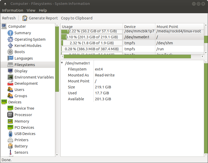 Removed default Debian from PBP; Bionic-mate-pinebookpro-0.9.14-1159 image unxz and dd to sdcard. Startup PBP with sdcard. Download the image again, unxz and dd to EMMC. Check with Gparted EMMC boot partition= fat16. Quit, remove sdcard en start PBP again. Mount the nvme SSD drive (ext4) sudo mount /dev/nvme0n1 /mnt (do check the device) copy the root file system from EMMC to nvme SSD sudo cp -avx / /mnt Label the nvme partition with Gparted: NVME Change root in /boot/extlinux/extlinux.conf root=LABEL=NVME Reboot and check with $ sudo lsblk -f