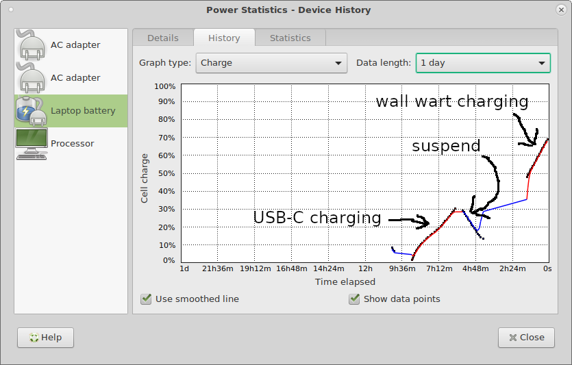 It seems that charging via USB-C is almost as efficient as using an actual charger. The suspend one is weirder: it uses energy as much as a charger can put in the battery. I entered suspend by clicking on the power button and then selecting suspend on the pop up menu. Obviously something is not being properly powered down. This is with the default Debian image.