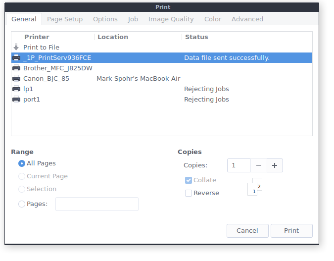 After I installed CUPS, I get this screen which shows my printers when I CTRL-P