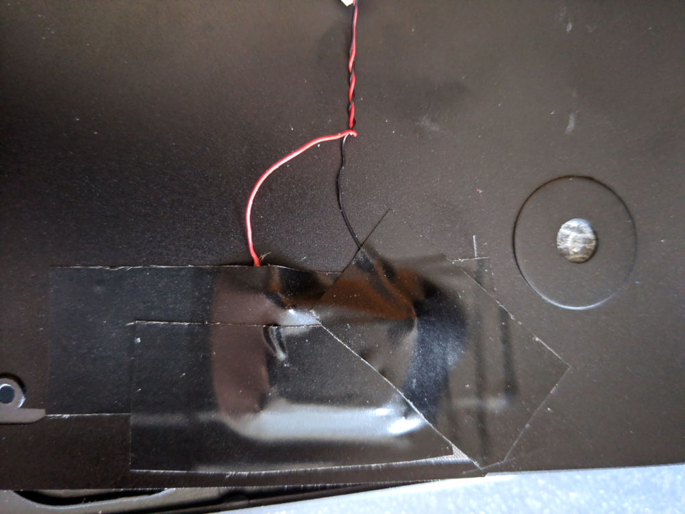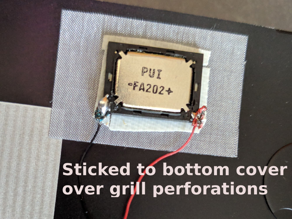 Applying double sided tape to the front contour of each speaker (pic 1), I was able to glue them directly over the mesh/grill areas on the bottom cover. I've then soldered (-) and (+) on both side (pic 2), before covering with electrical tape (pic 3). The finishing touch was to apply some thin foam layers with double sided tape just over each speaker to act as dampers inside the housing sandwich (pic 4).