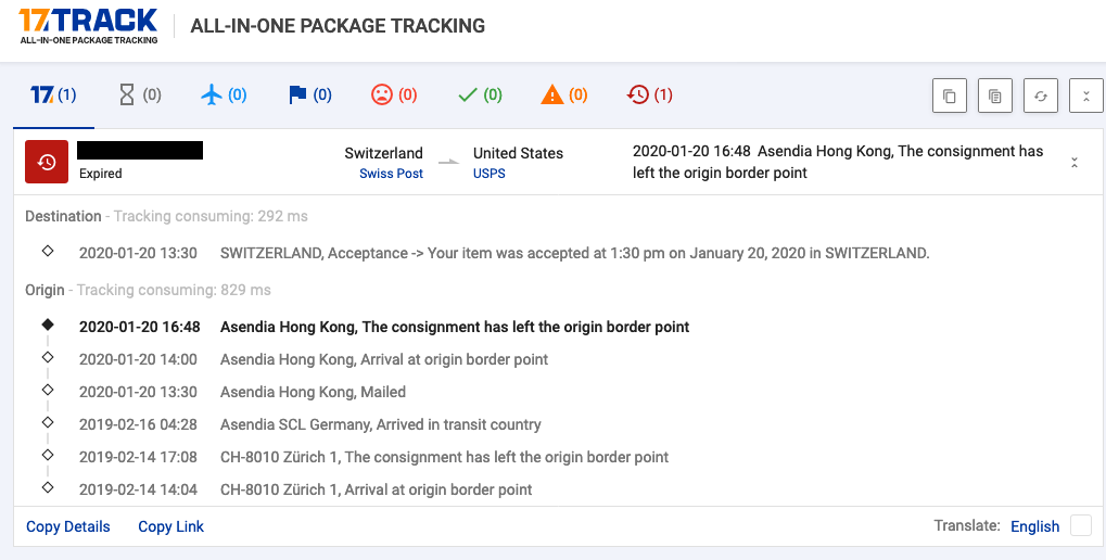 (01-22-2020, 05:35 PM)kiddailey Wrote: Can anyone confirm if their tracking link displays accurate information?  The tracking number that I received shows that my order was shipped February of 2019 from Zürich, then went to Hong Kong, then arrived in Switzerland on the 20th, and has now been marked as "Expired." (See attached)
