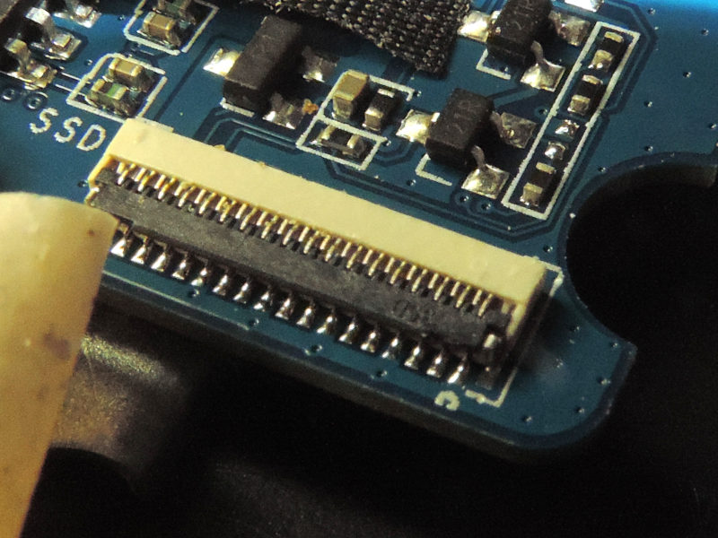 If I hadn't scanned it I wouldn't have noticed that there's an end for the SSD and one for the board. But this is the cable from Ameritron. The connector on the adapter board is a little easier to experiment with because I don't have to have the PBP apart to do it. I think I can see the unmounted part moving a little when I push with with a fingernail. I was using a circular fluorescent light with a magnifier in the center plus my reading glasses. I also have a pair of cheap binocular magnifiers. No decent binocular microscope or micromanipulater.